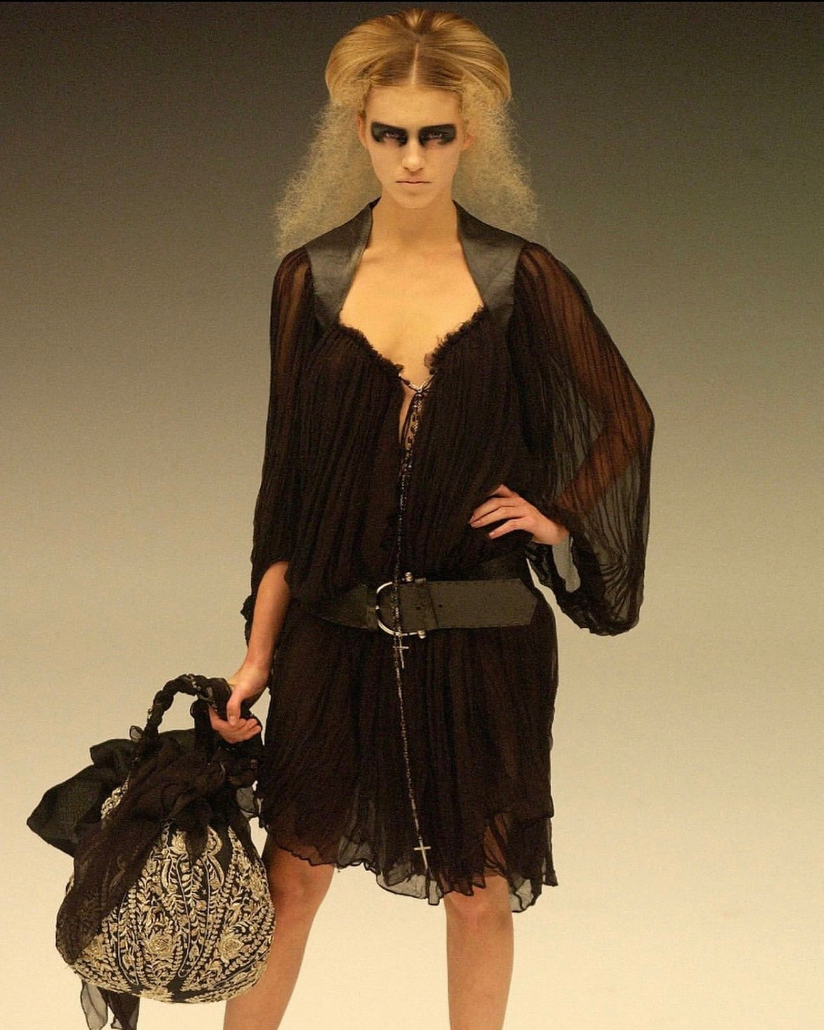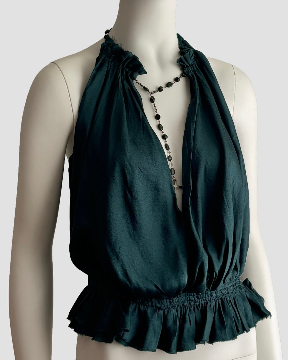 Silk plunging top with rosary cross necklace in teal from Alexander McQueen Spring/Summer 2003 'Irere' runway collection. Features a 2 side button closure.