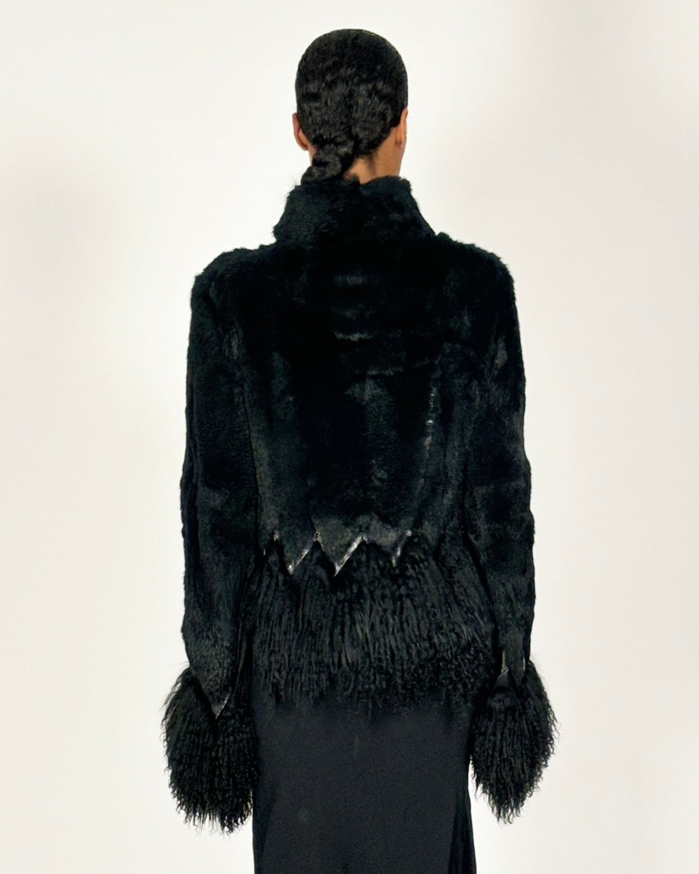 Softest fur jacket with slightly upturned colour and accentuated Mongolian fur sleeves and lining. Leather tie fastening. Similar styles featured on the Autumn/Winter 1999 runway.
