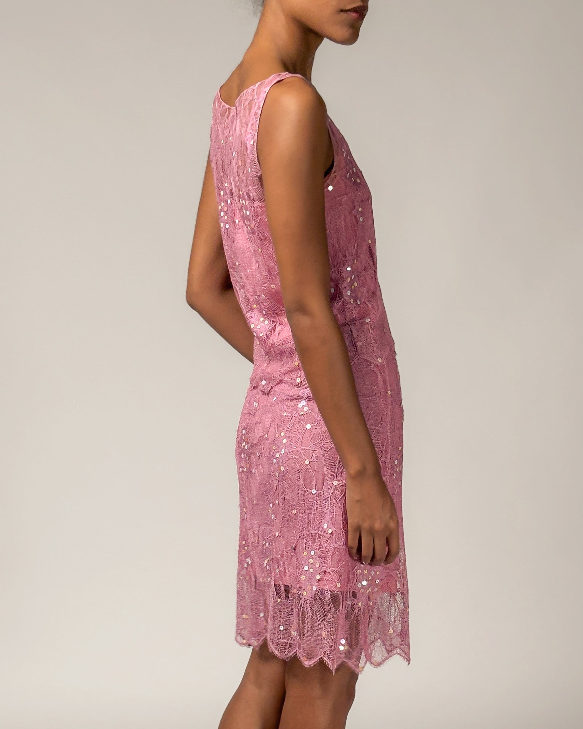 Matching lace top and skirt adorned with iridescent sequins and scalloped hemline. The sheer top comes with a separate tank top to be worn underneath if desired. Designed by Karl Lagerfeld for the Spring/Summer 2000 collection.