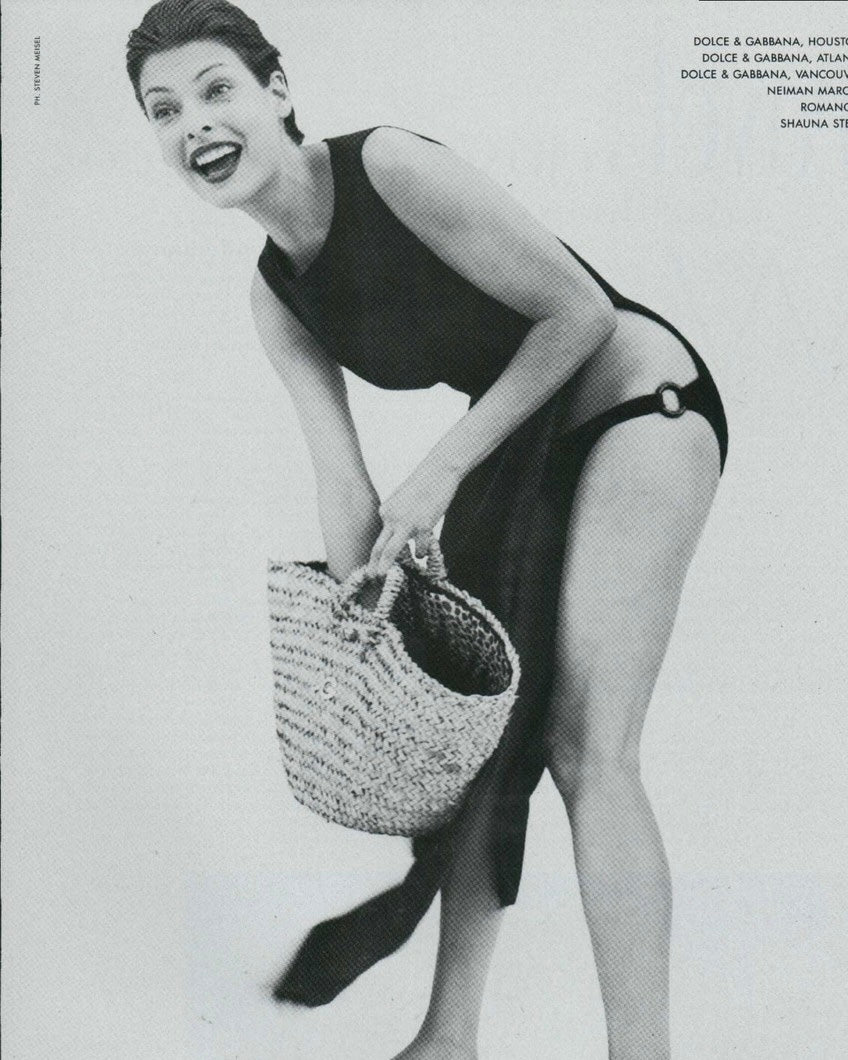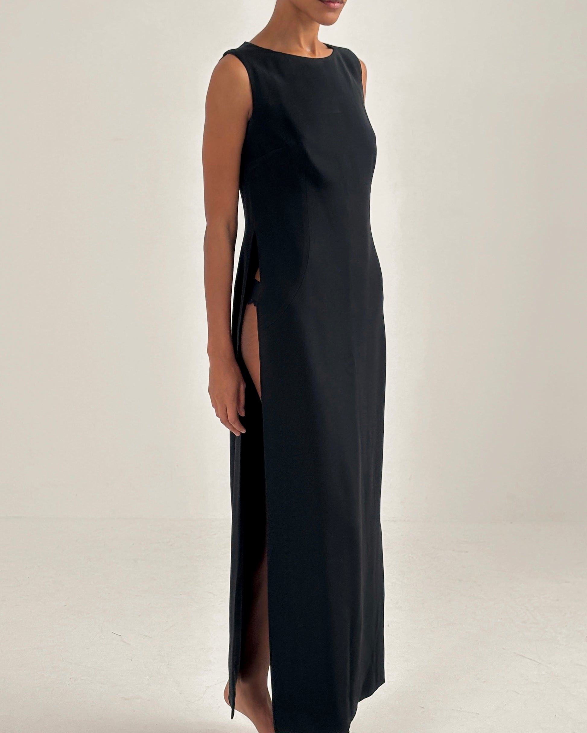 Sleeveless maxi dress featuring high-slits on both sides. Worn by Shalom Harlow on the Spring/Summer 1996 runway and Linda Evangelista in the ad campaign.