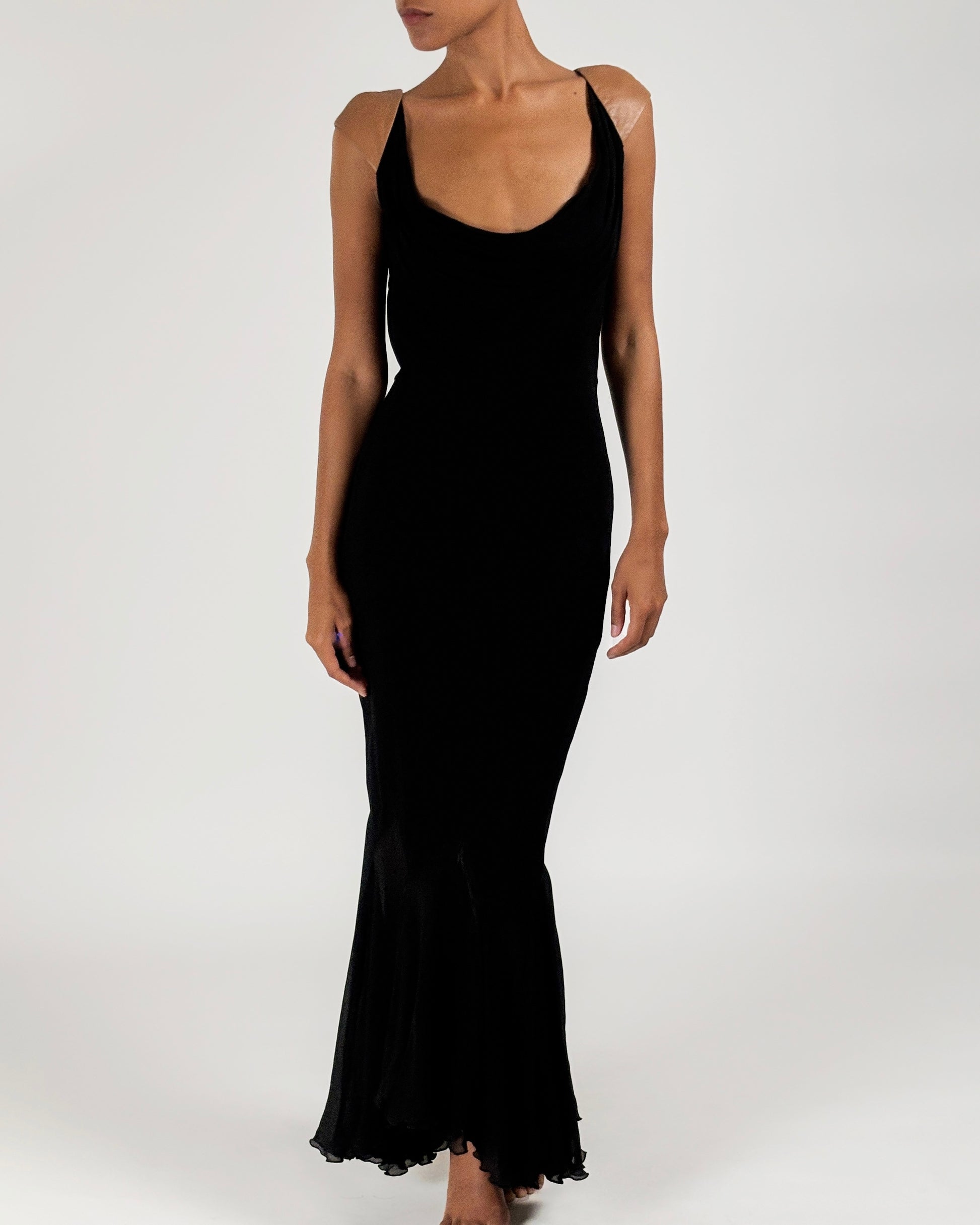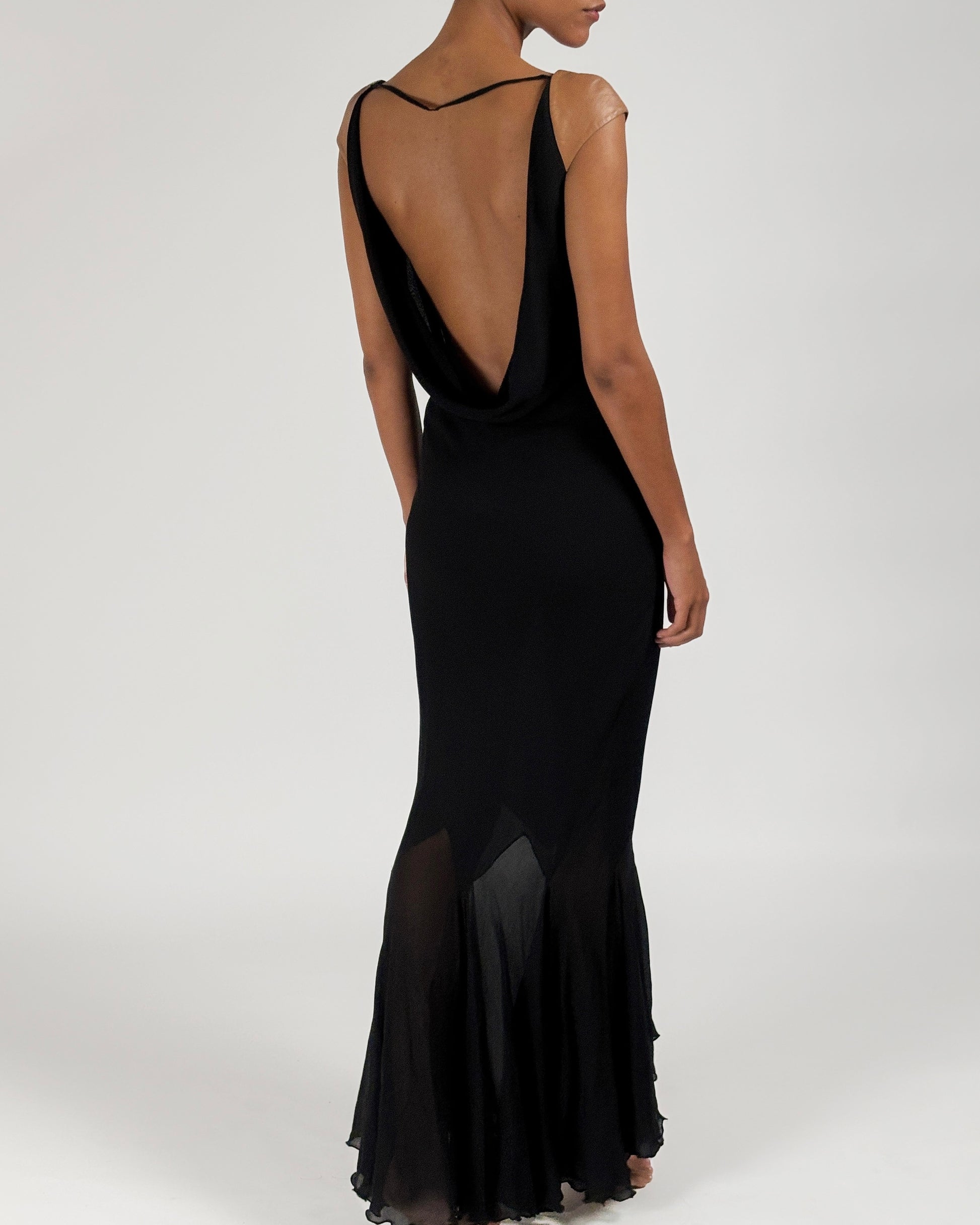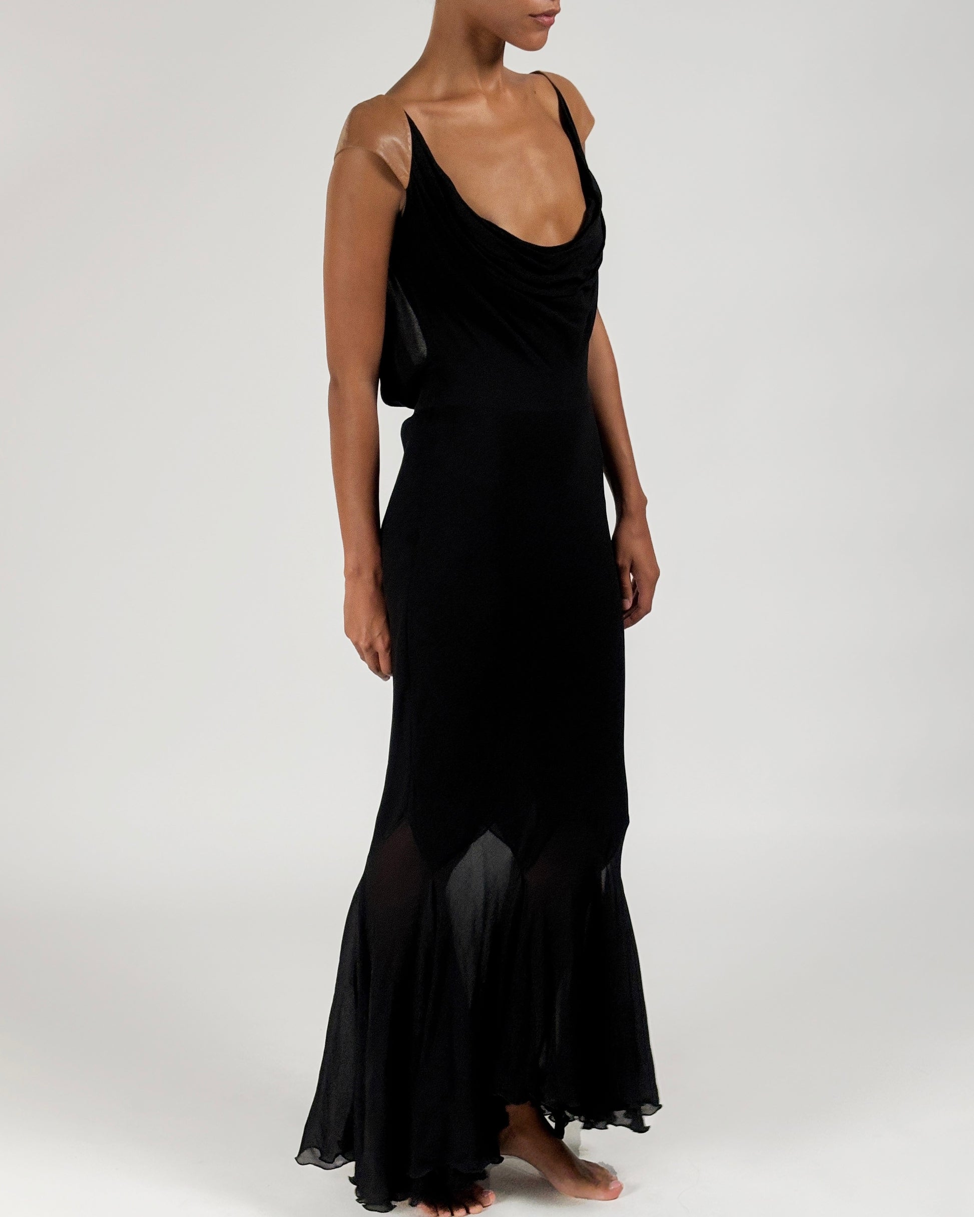 Floor-length gown featuring multiple layers of luxurious black silk chiffon and a semi-sheer harlequin hem below the knees worn on Shalom Harlow on the Gianni Versace Autumn/Winter 2001 runway.