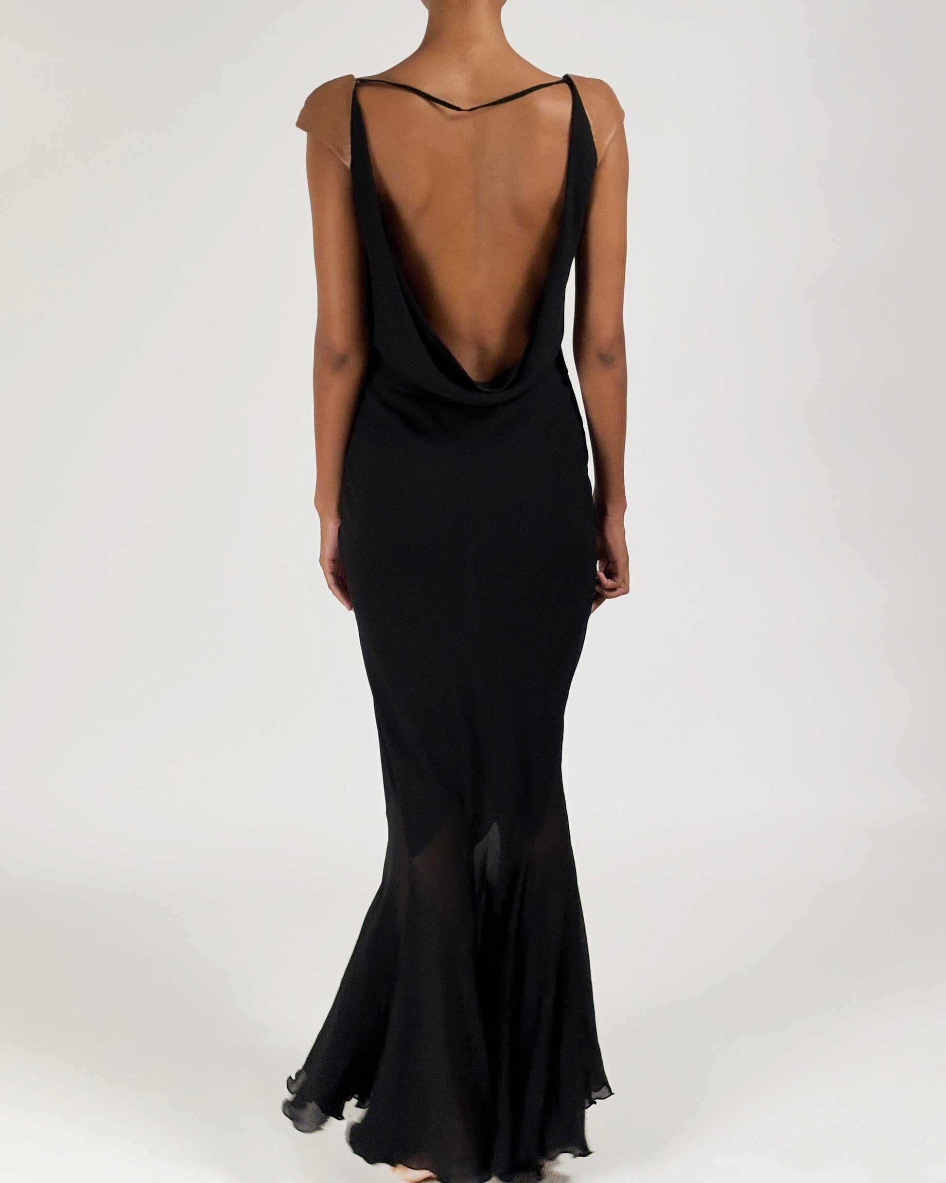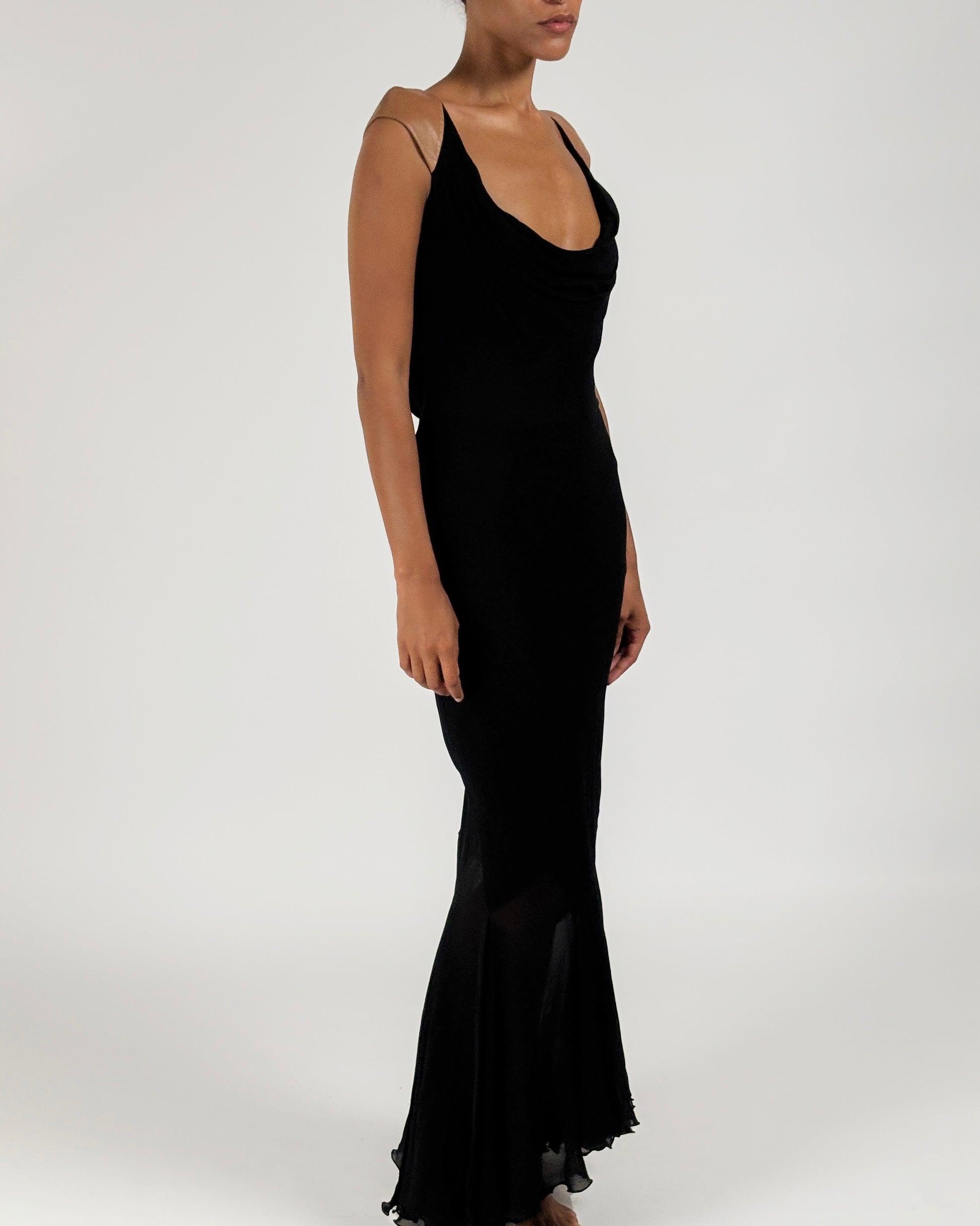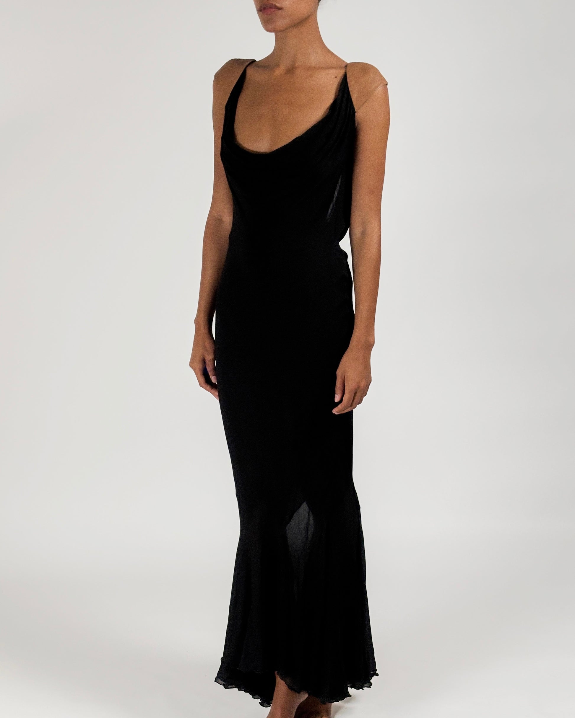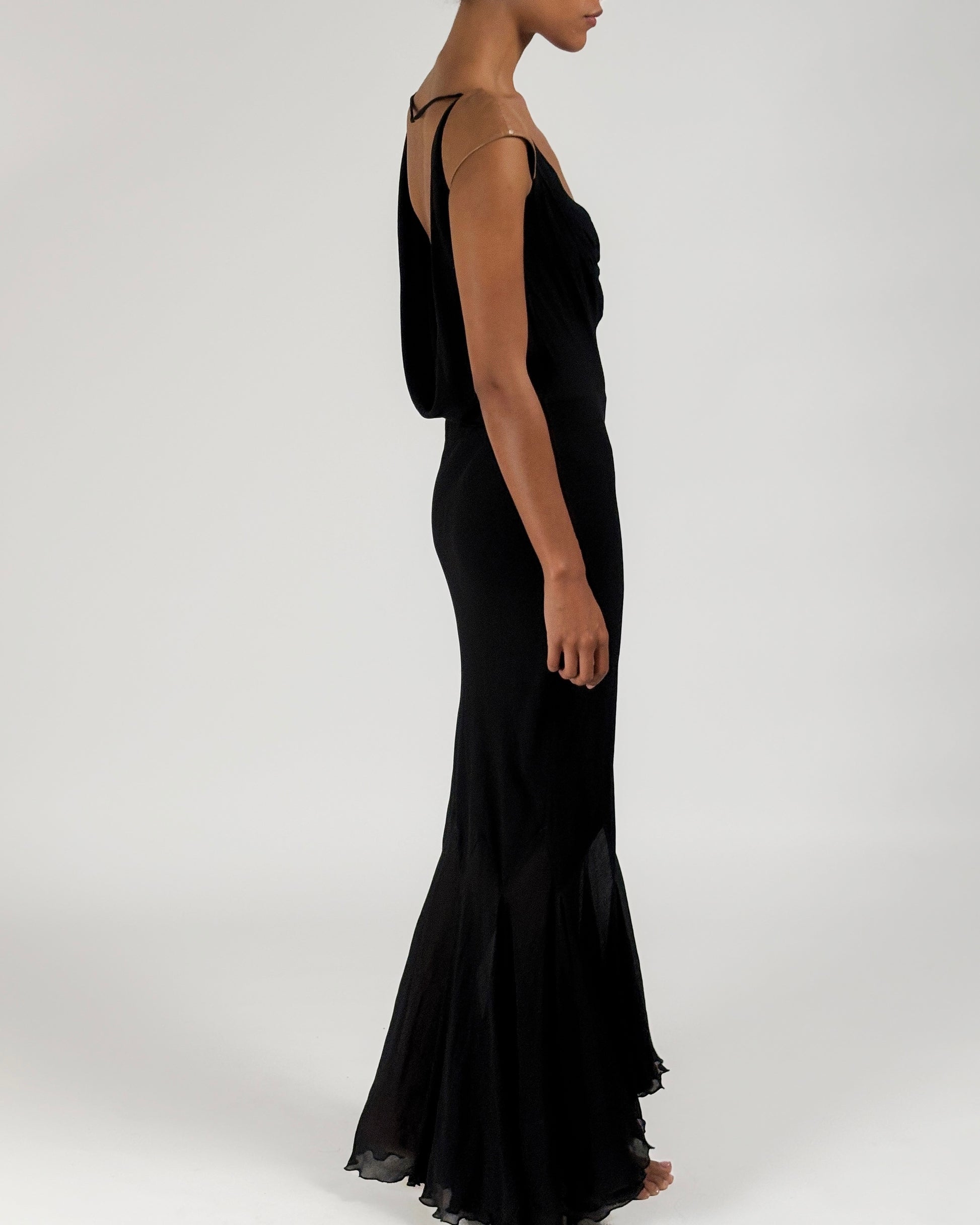 Floor-length gown featuring multiple layers of luxurious black silk chiffon and a semi-sheer harlequin hem below the knees worn on Shalom Harlow on the Gianni Versace Autumn/Winter 2001 runway.