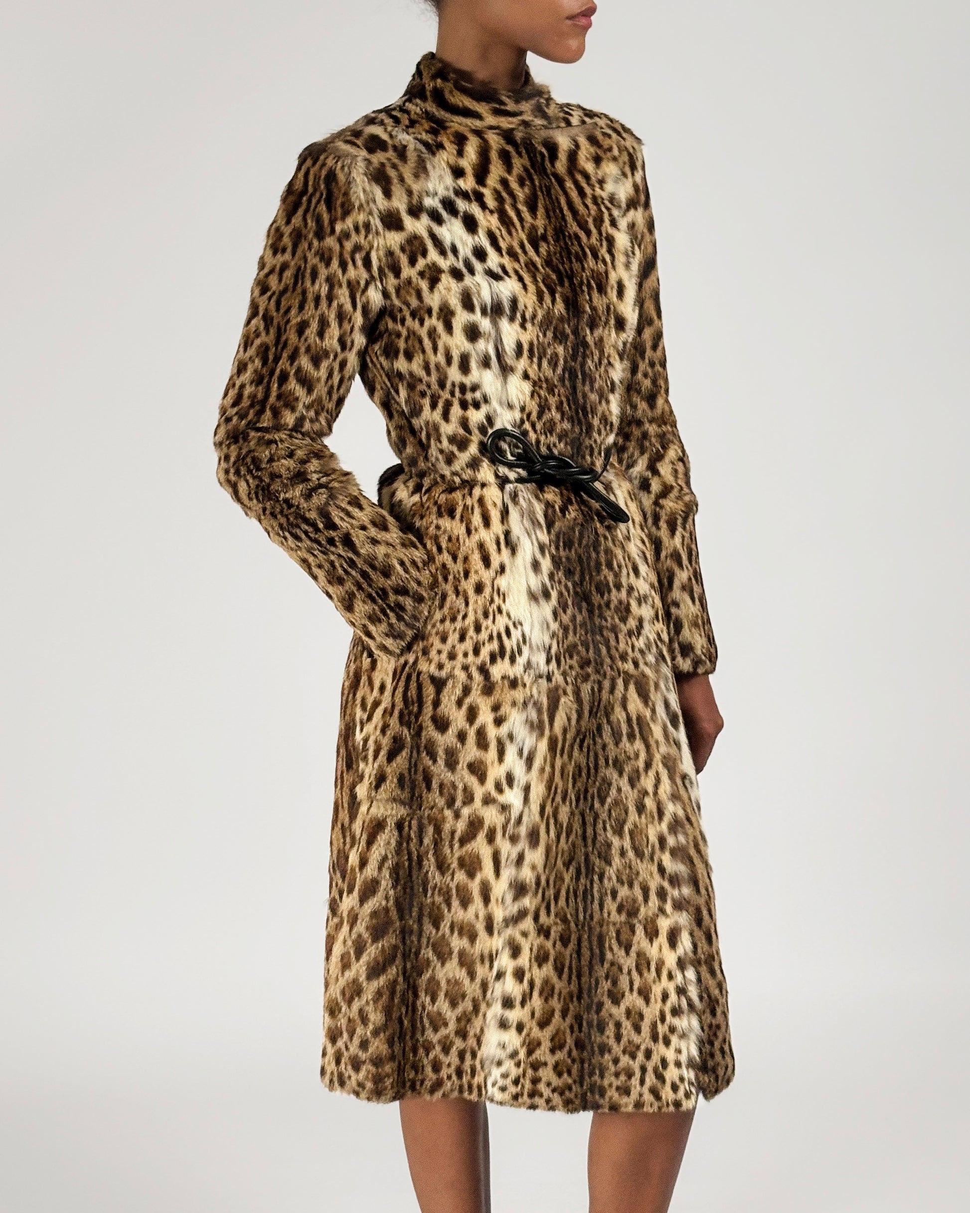 Luxurious leopard print rabbit fur jacket from Gucci by Tom Ford Autumn/Winter 1999. Features leather lining, hidden front zip fastening and removable leather cord belt. Featured on the runway and the ad campaign.