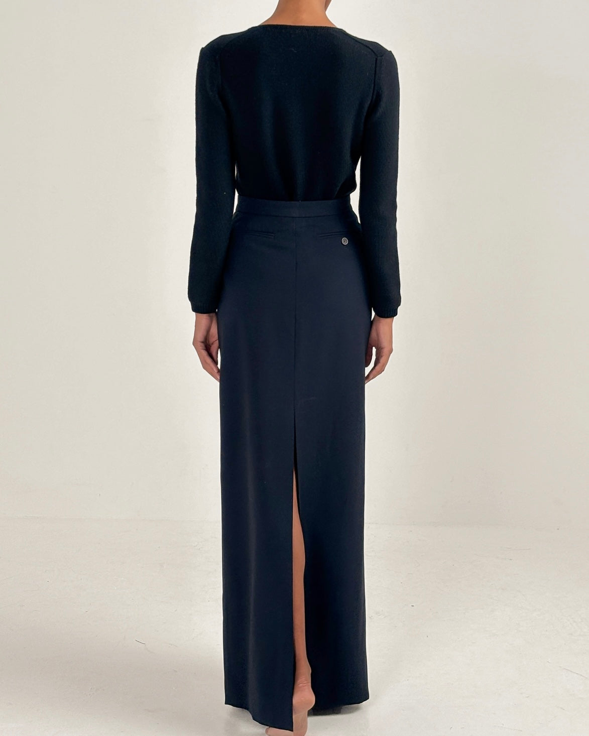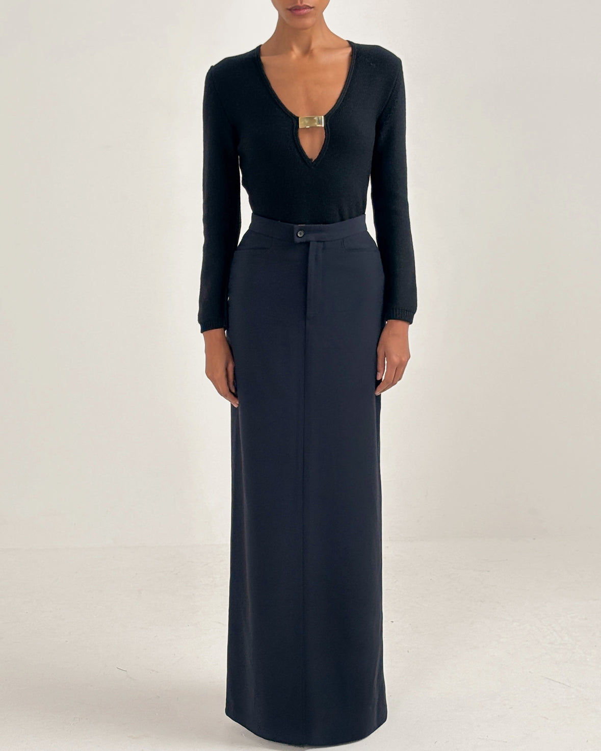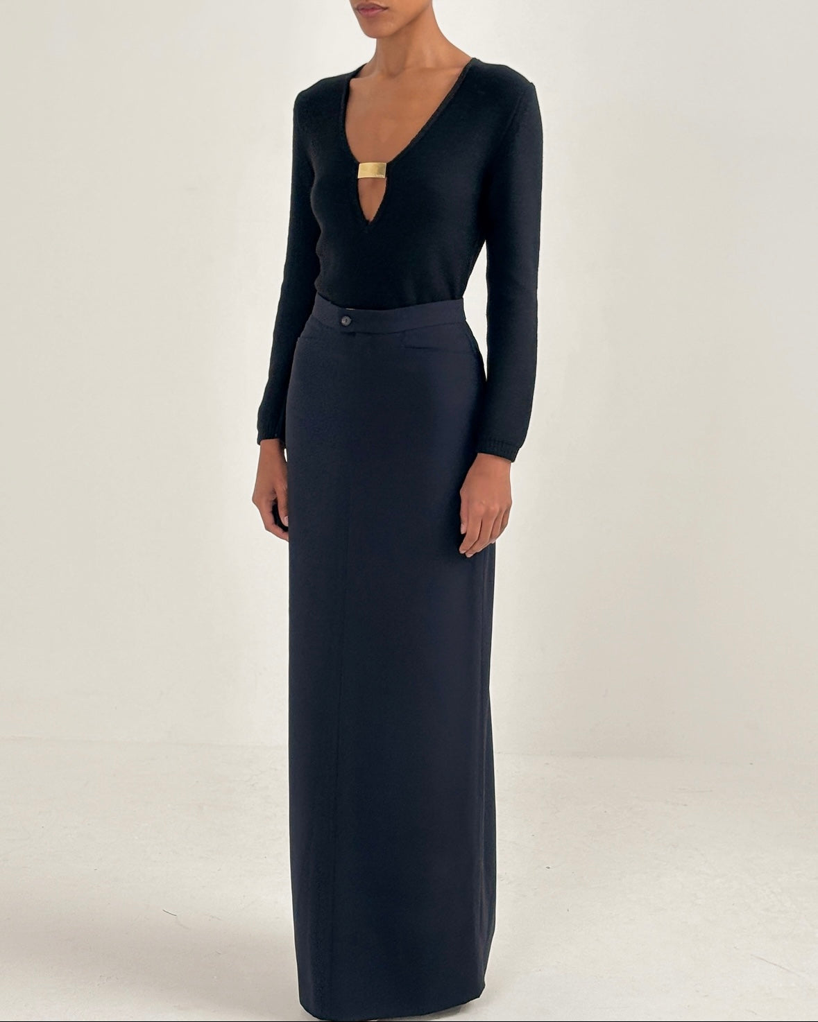 Runway set featuring a floor-length maxi skirt and a plunging knit jumper with gold detailing from Gucci Autumn/Winter 1996.