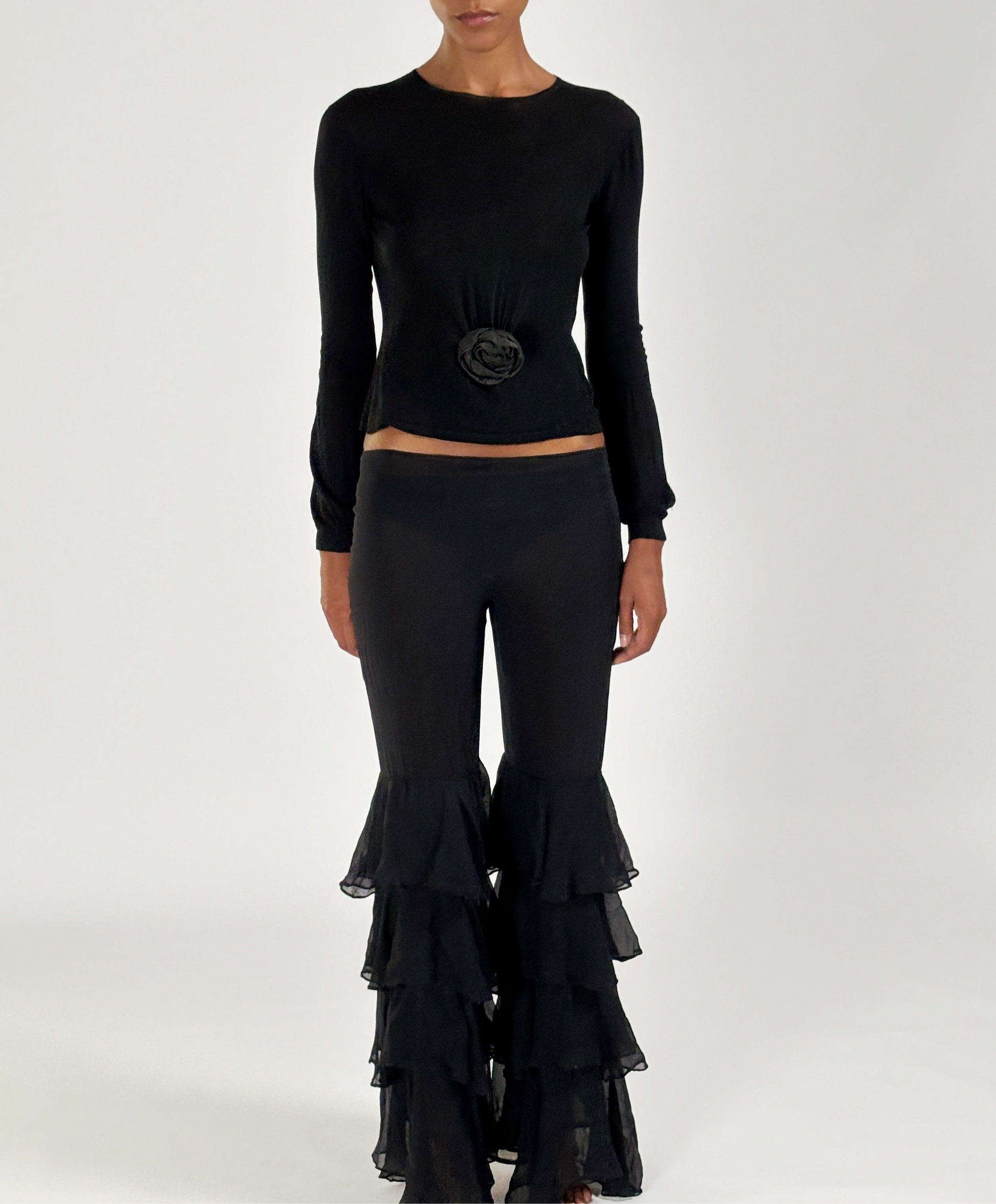Lightweight low-waisted silk chiffon trousers with ruffle detailing and long-sleeve top with leather flower appliqué ensemble featured on the Gucci Autumn/Winter 1999 runway.