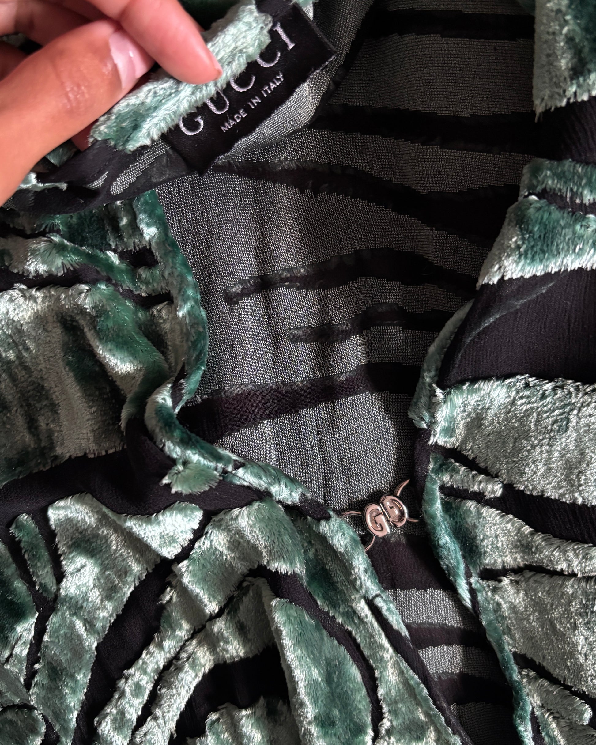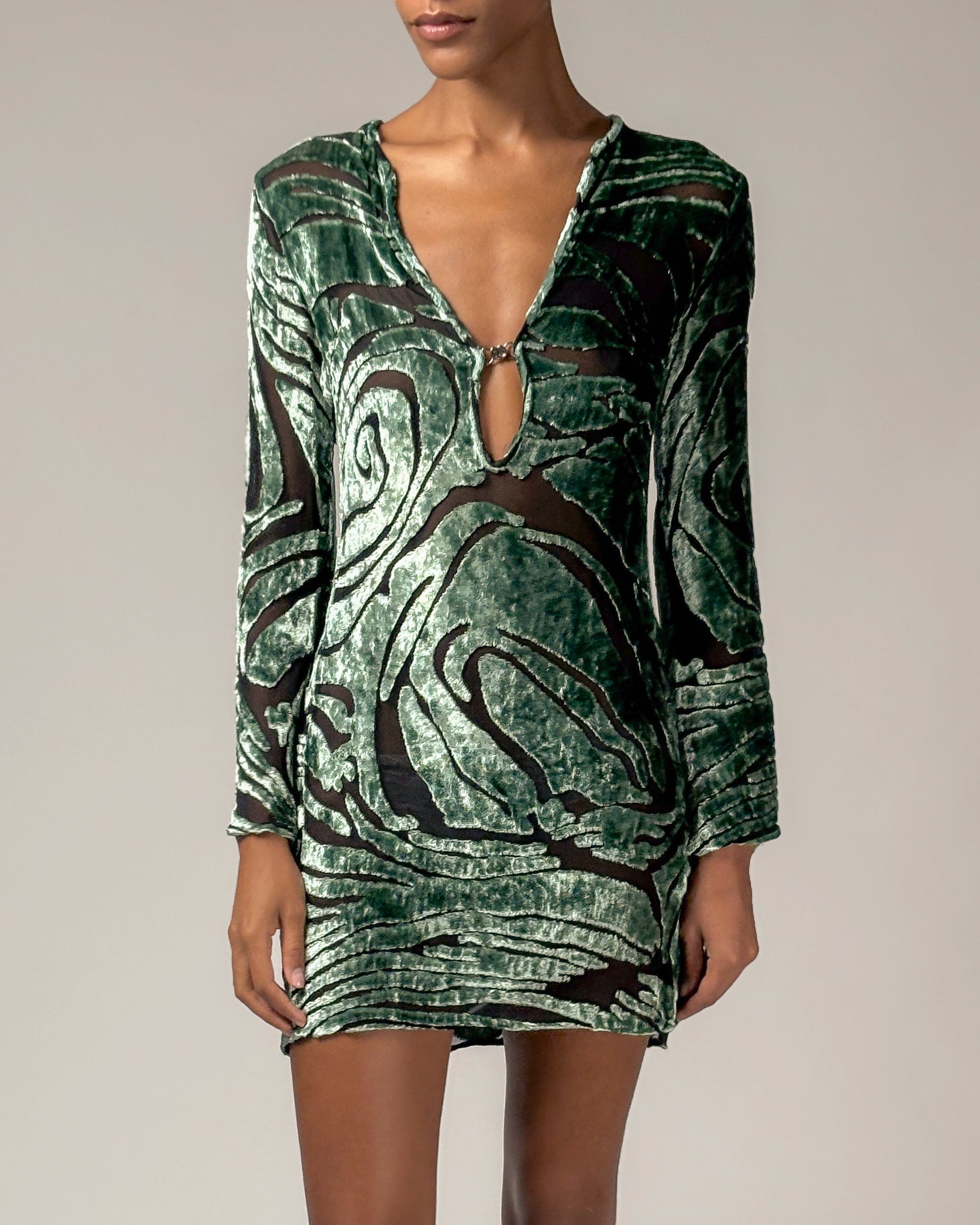 Softest teal velvet and semi-sheer chiffon mini skirt featuring long flared sleeves, a relaxed deep v-neck and silver interlocking Gucci keyhole closure. Worn by Shalom Harlow on the Gucci Spring/Summer 1996 runway, and also featured in the ad campaign.
