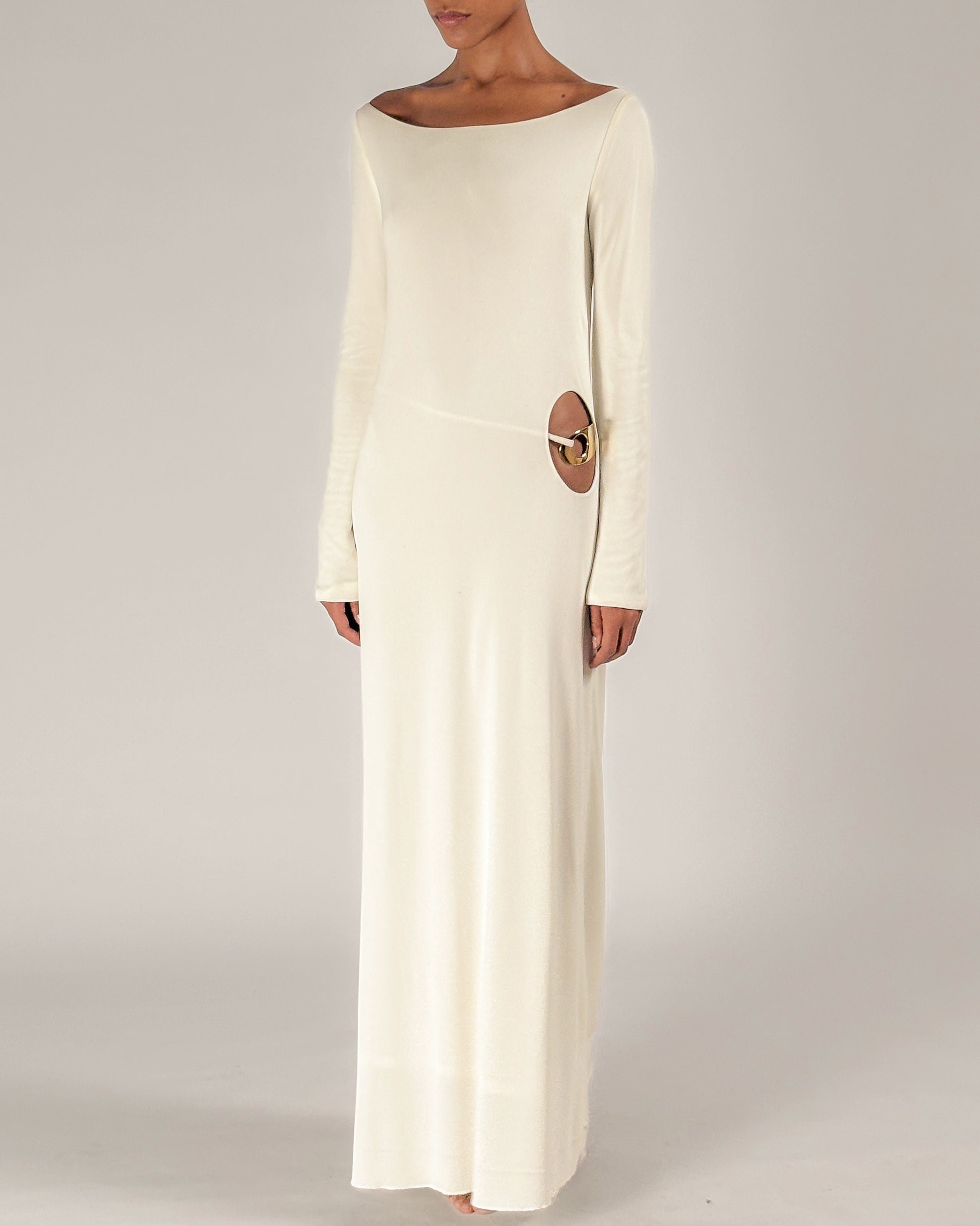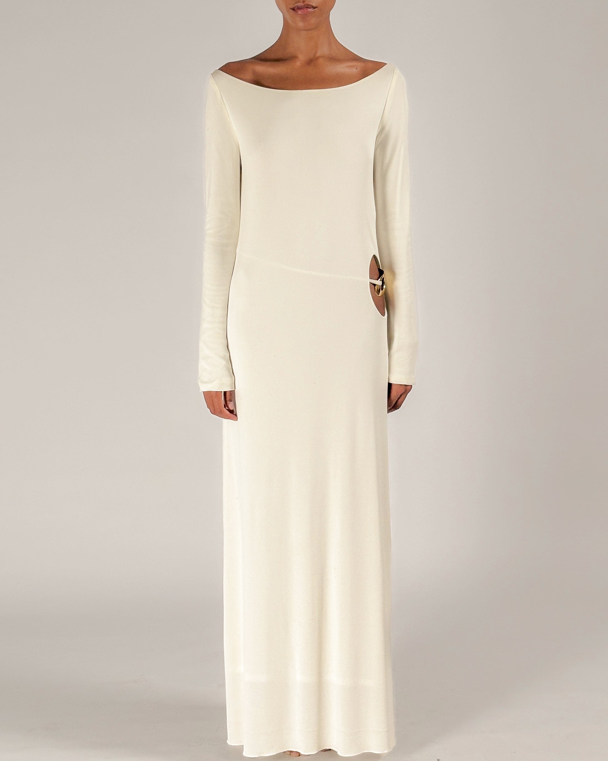THE most sought-after and recognisable dress from Tom Ford's tenure at Gucci. This Halston-inspired full-length dress is made of a beautiful slinky jersey that skims over the body. Comes with the matching gold metal g-string that peaks perfectly through the keyhole on the hip.