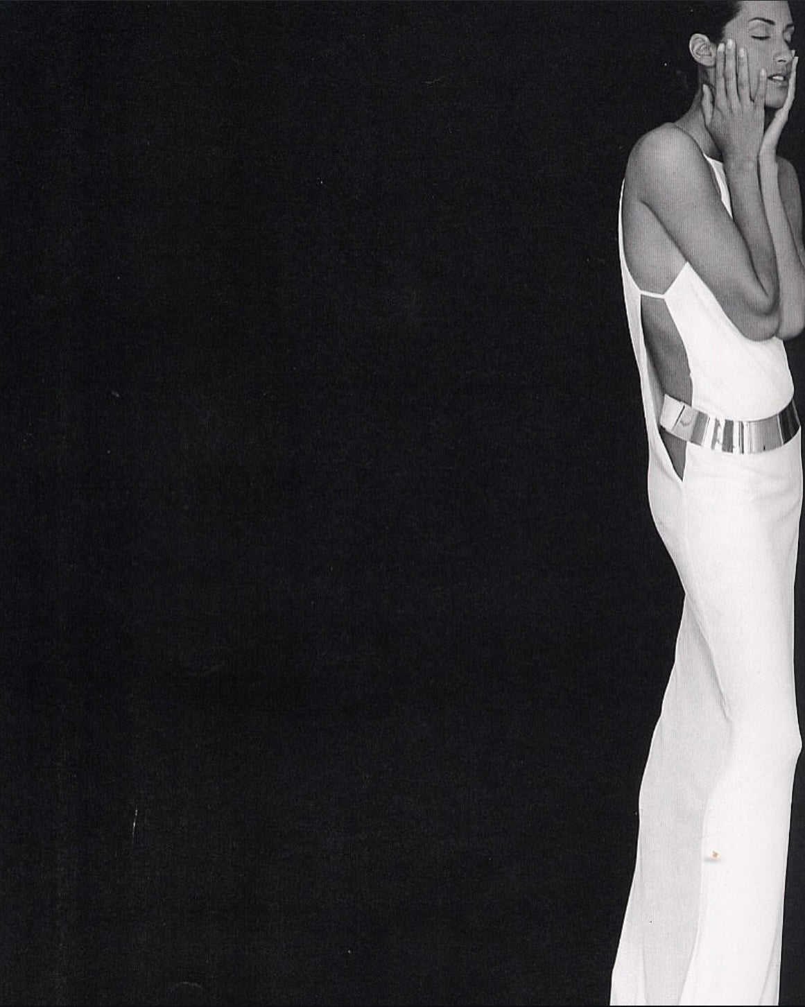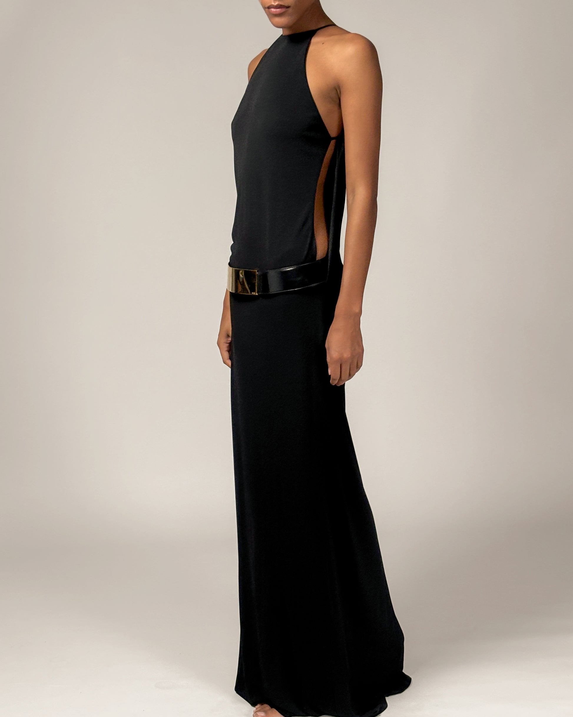 High neck black maxi dress with thin leather straps, keyhole cut-out sides & back opening with gold hardware belt with Gucci engraving from Gucci by Tom Ford Autumn/Winter 1996 runway.