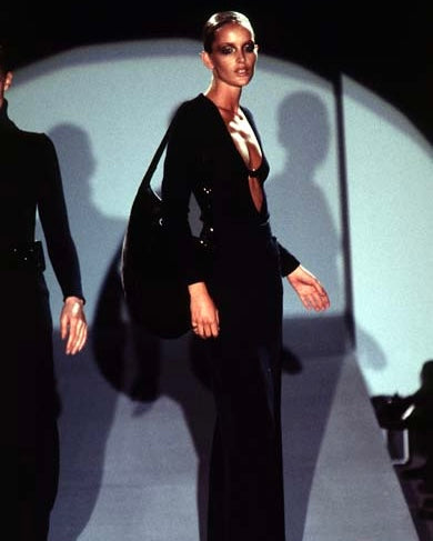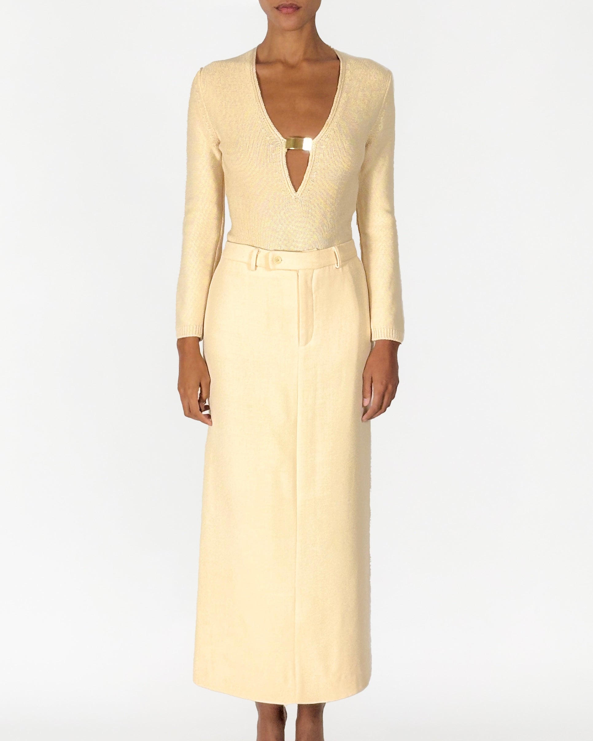 Worn in black on the runway, this chic set features a floor-length maxi skirt and a plunging knit jumper with gold detailing, from Gucci by Tom Ford Autumn/Winter 1996 runway collection.