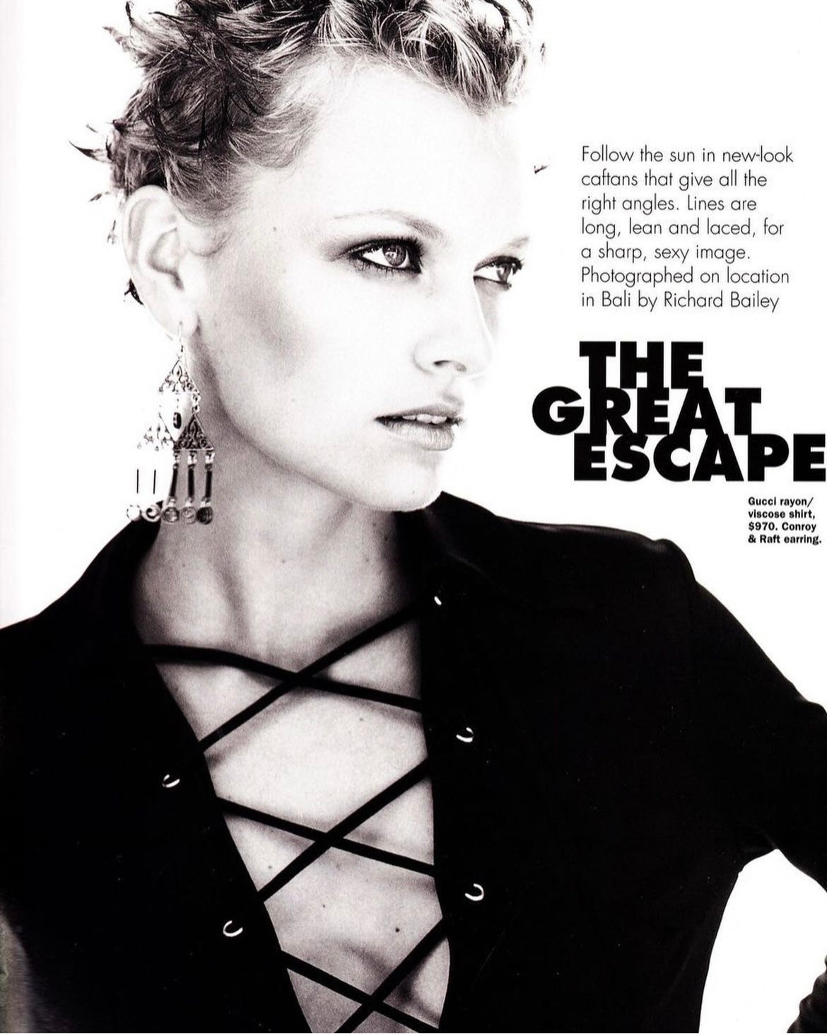 Micro mini safari dress featuring lace-up detailing and a patent leather G belt from Gucci by Tom Ford Spring/Summer 1996 runway collection. Modelled by Filippa von Stackelberg in the ad campaign and the long version worn by Linda Evangelista on the runway.