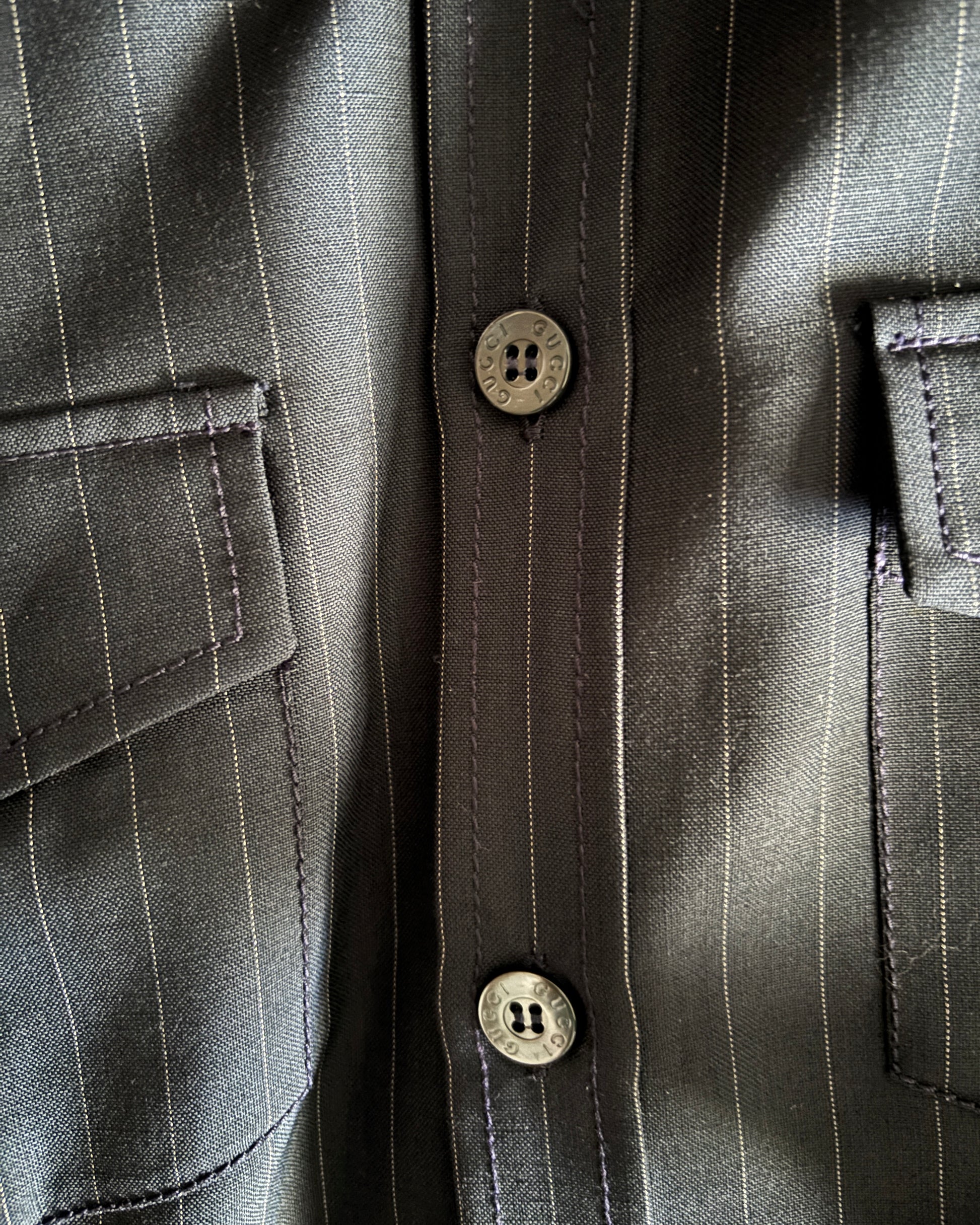 Pinstripe set featuring low-waisted mini shorts and matching military-style shirt famously worn by Kate Moss on the Gucci Spring/Summer 1996 runway. The set was also shown in the ad campaign.
