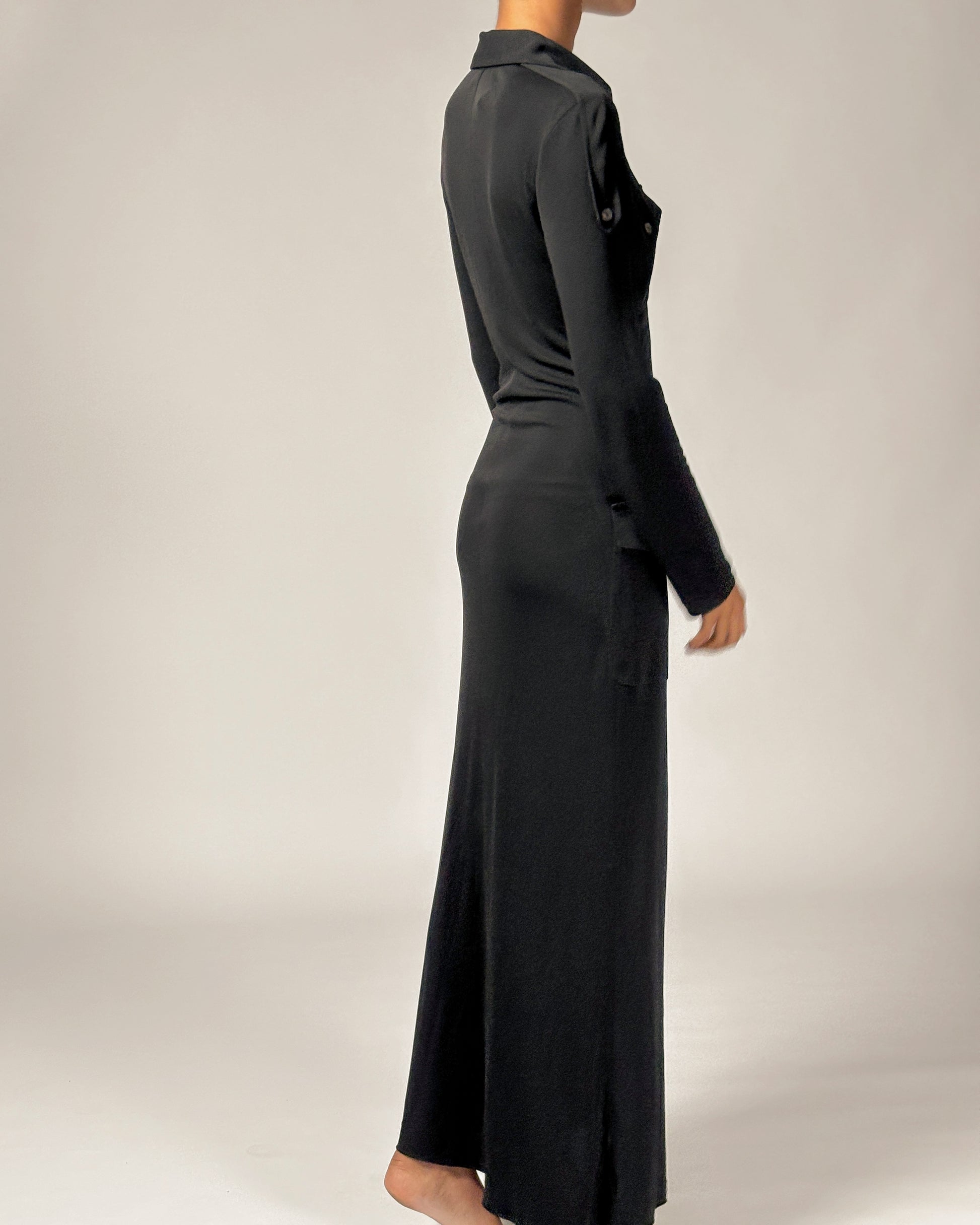 Full-length dress featuring long sleeves, an exaggerated fold-over collar, a deep v-neckline, and flap pockets at the bust and hips. Featured on the Autumn/Winter 1996 runway and in numerous ad campaigns.