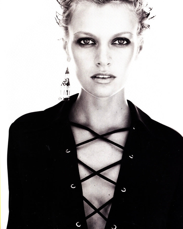 Micro mini safari dress featuring lace-up detailing from Gucci by Tom Ford Spring/Summer 1996 runway collection. Modelled by Filippa von Stackelberg in the ad campaign and the long version worn by Linda Evangelista on the runway.