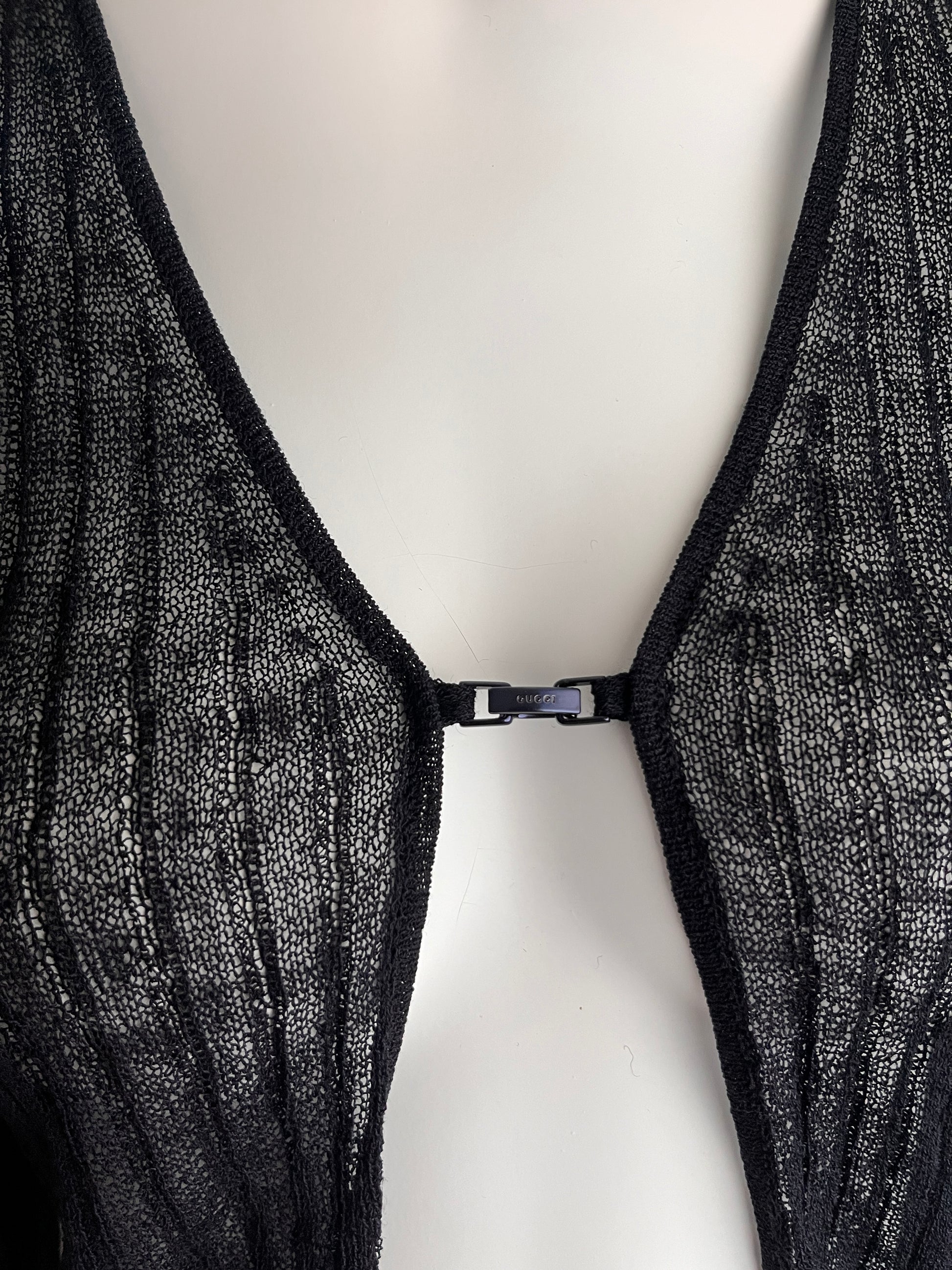 Long-sleeve knit top with 'Gucci' logo engraved link, in a sheer black, from Gucci by Tom Ford Spring/Summer 1997 collection