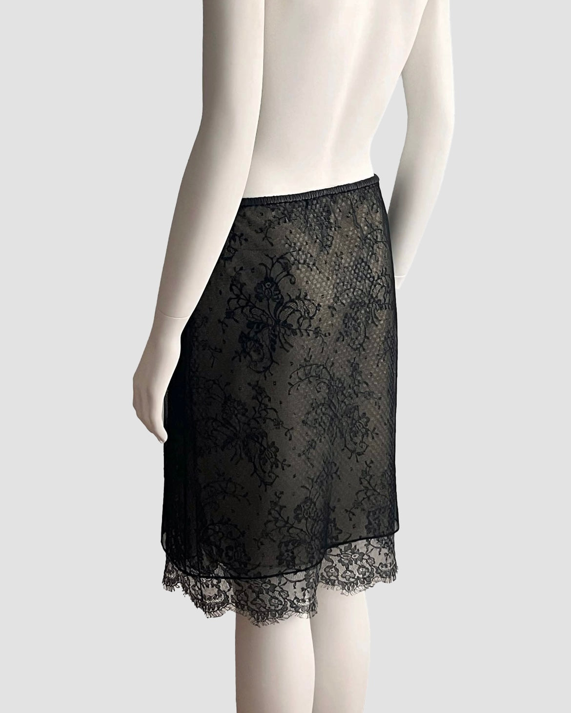 Lace skirt comprised of 3 layers: soft black tulle, metallic dot lace and nude silk chiffon, with a leather waistband from the Gucci by Tom Ford Spring/Summer 1999 runway.