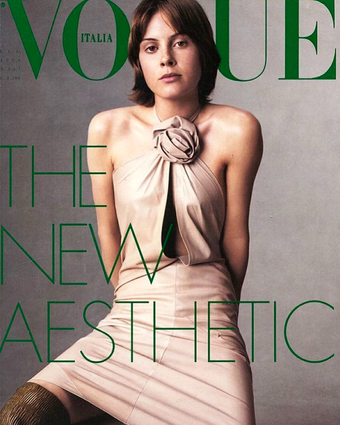 Pink nude leather dress with boat neckline and side ruching with leather flower applique detailing featured on the Spring/Summer 1999 runway. Has side zip and hook-and-eye closure on the right shoulder for putting on the dress.