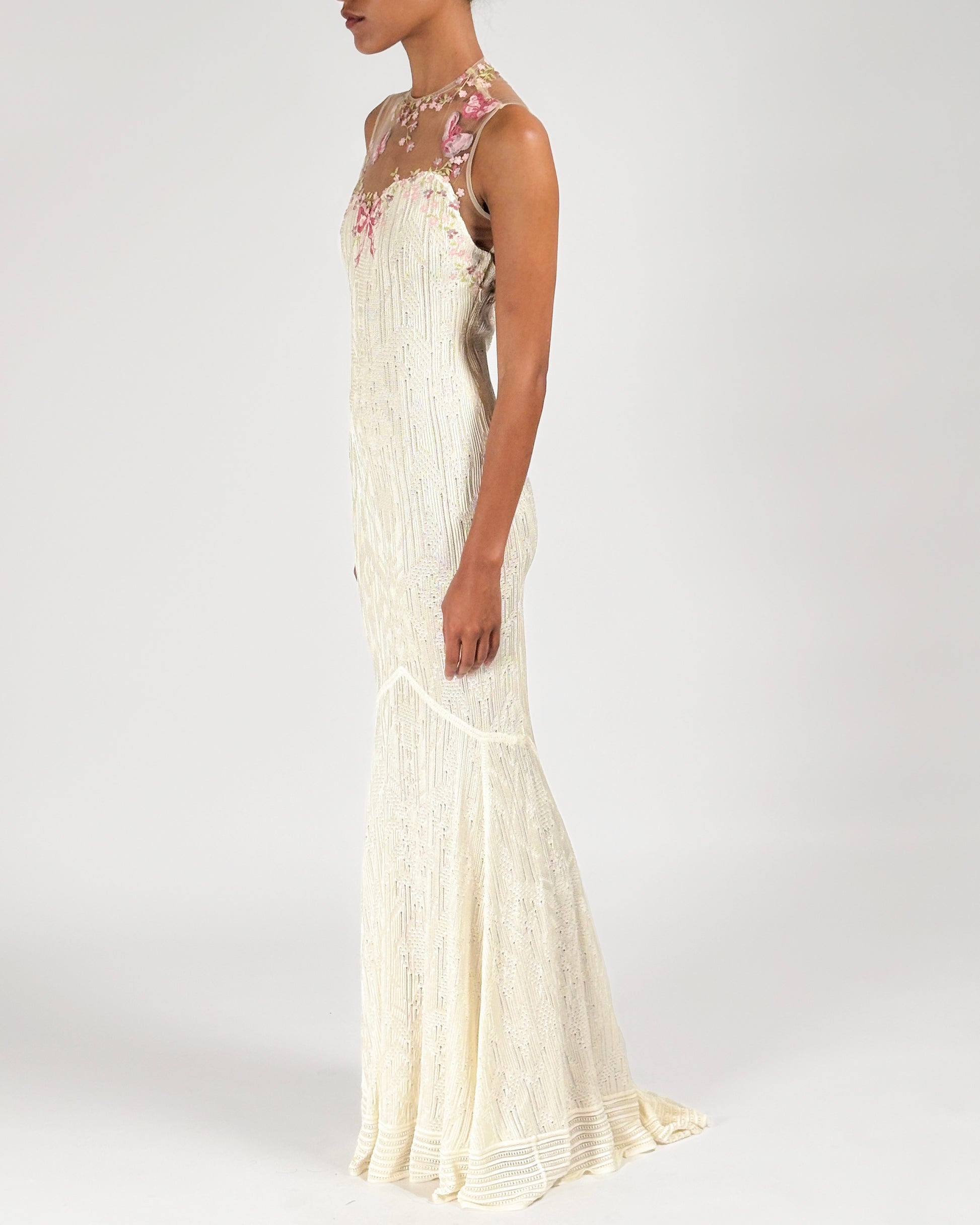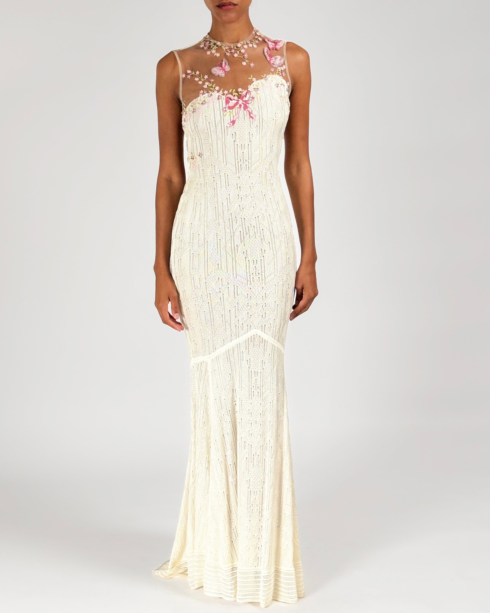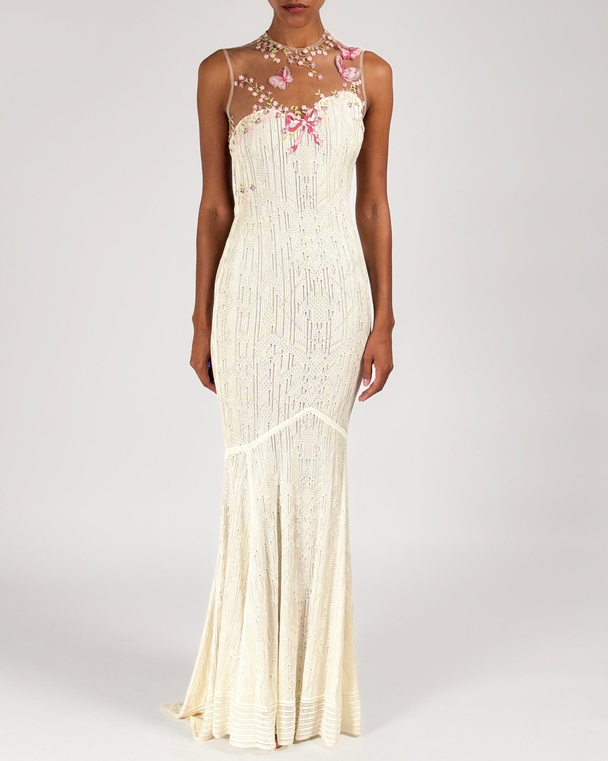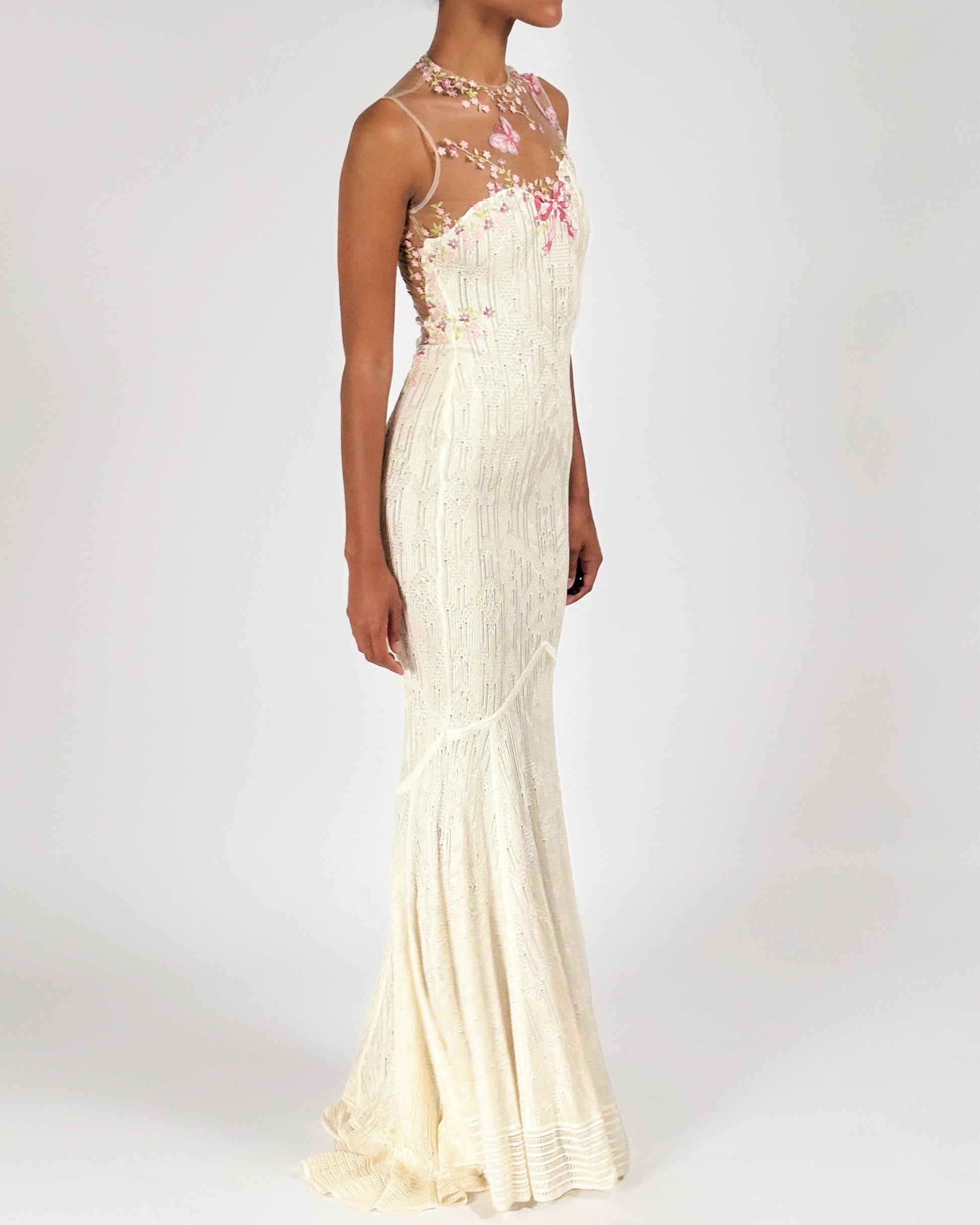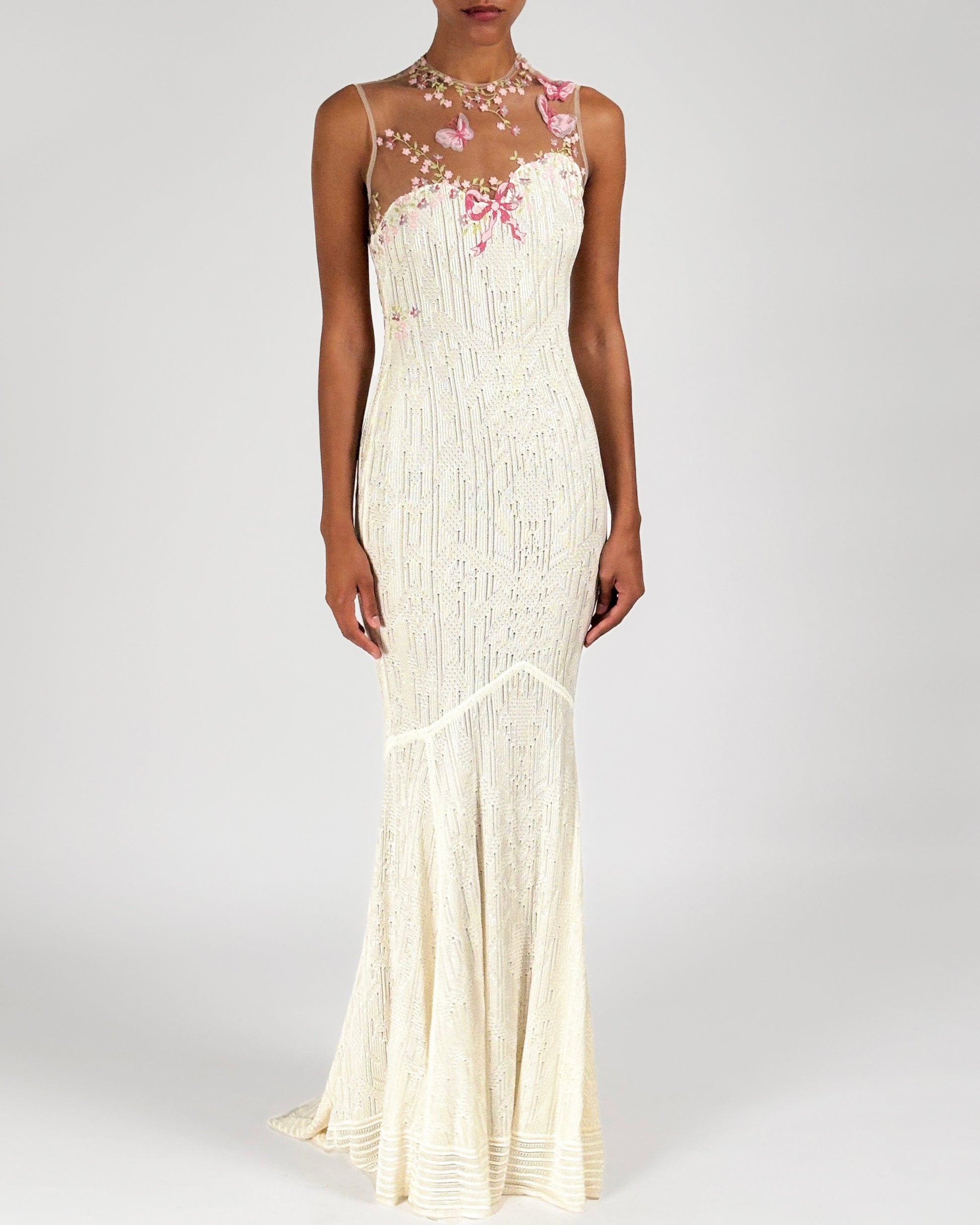 John Galliano 1998 Floral Embroidered Tulle Knit White Dress