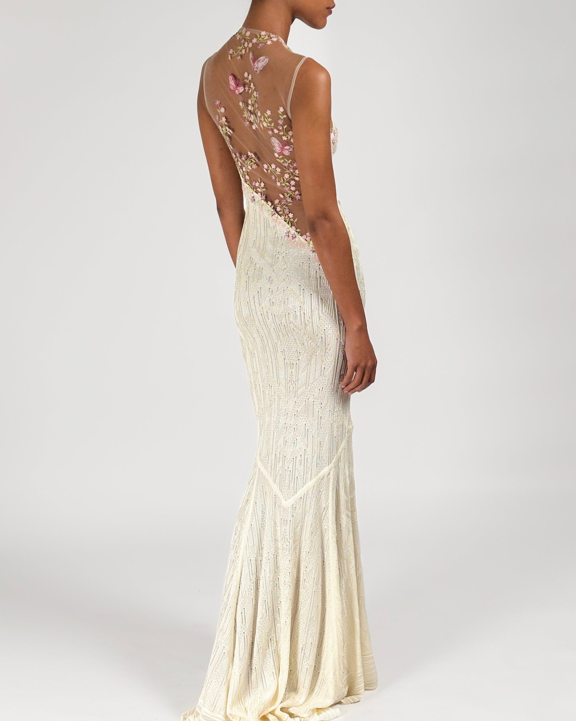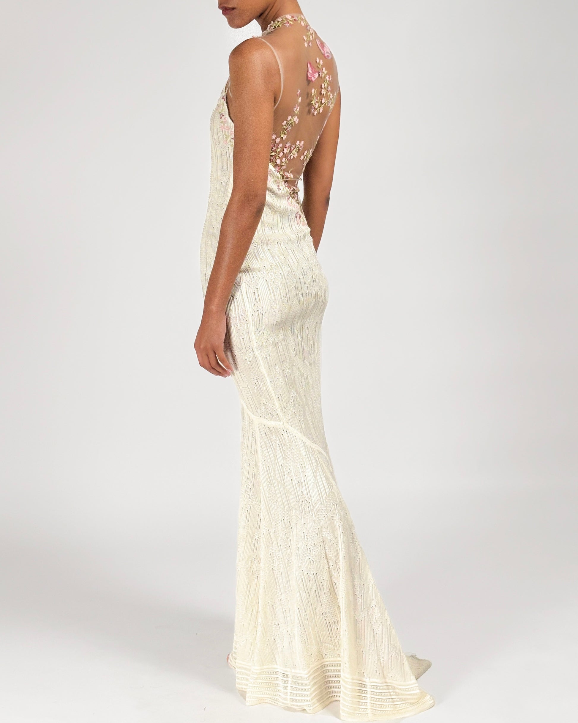 Heavenly white dress from the John Galliano Spring/Summer 1998 runway - a true one a kind masterpiece! Features a beautiful plunging open back and hand-embroidered floral and butterfly appliqué on a semi-sheer tulle bust. The bust has interior bra padding and the skirt is a descending small train.