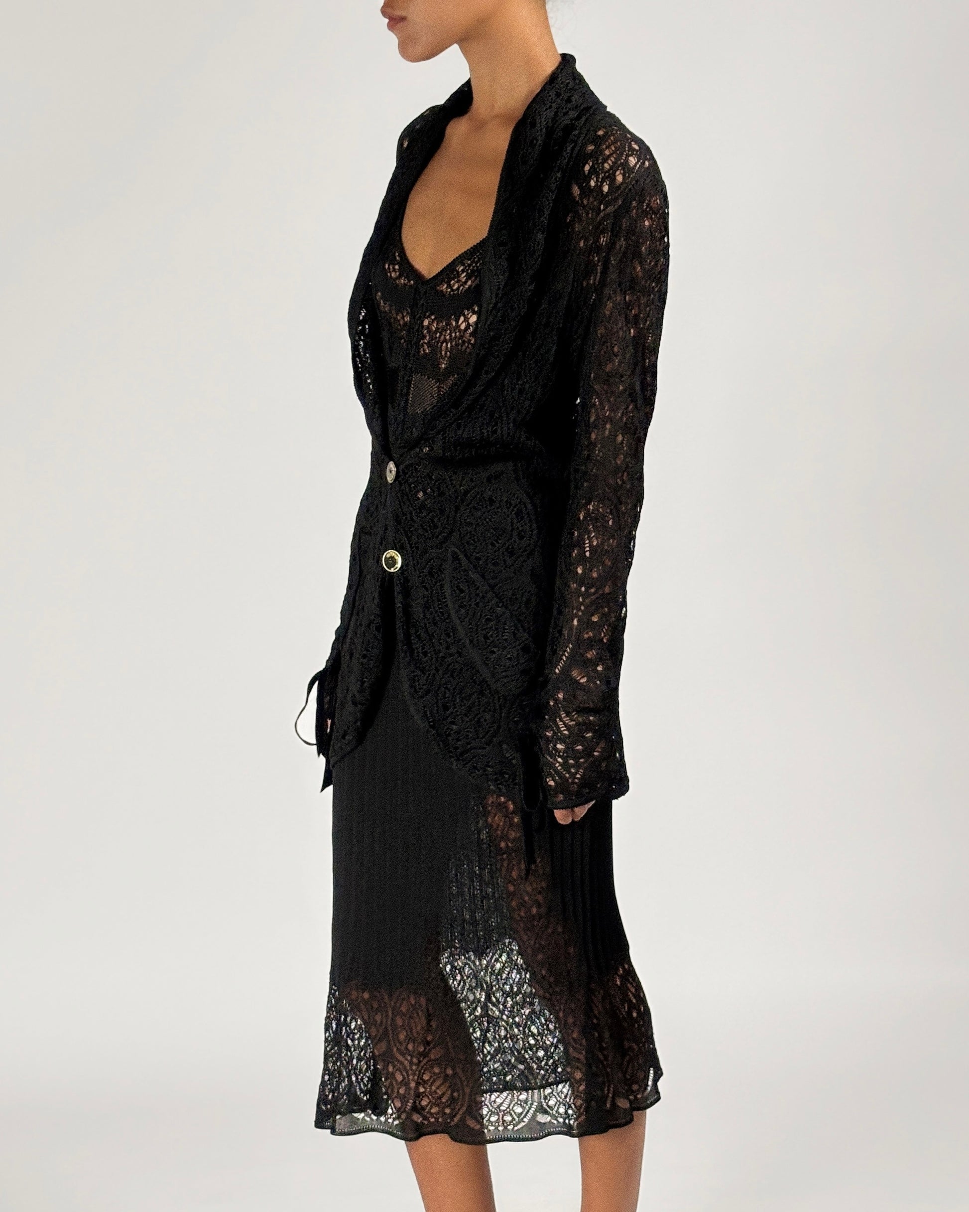 Black crochet knit set featuring a matching jacket, skirt and tank top from John Galliano Spring/Summer 1999