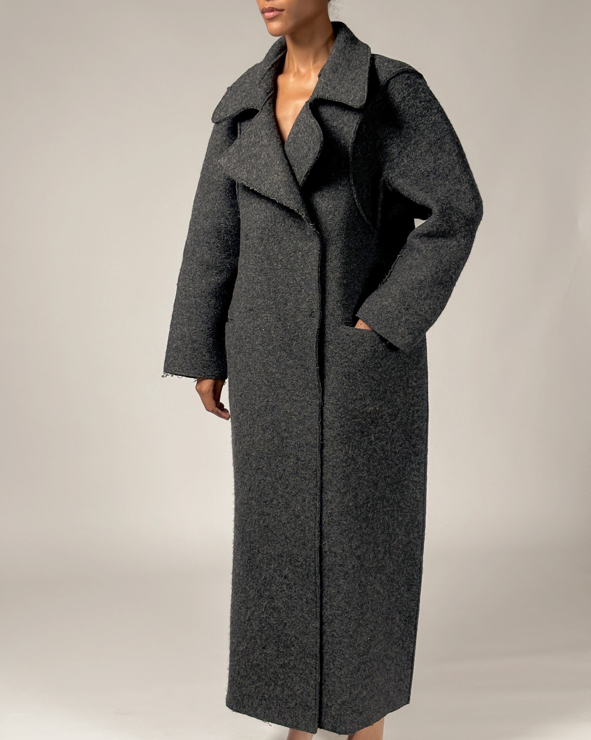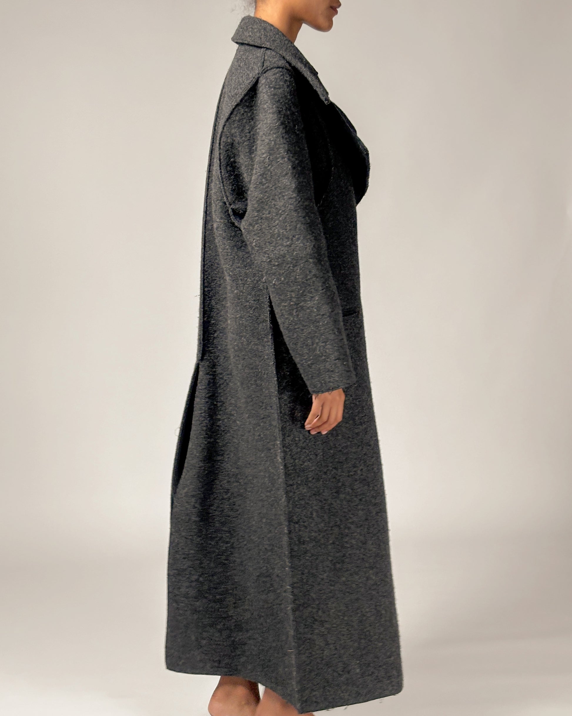 Charcoal grey wool coat from the iconic Maison Martin Margiela's Autumn/Winter 1998 "flat" collection. Constructed from multiple panels of heavy wool felt existing as a two-dimensional flat object when unworn. Wonderfully rare and radical archive piece.