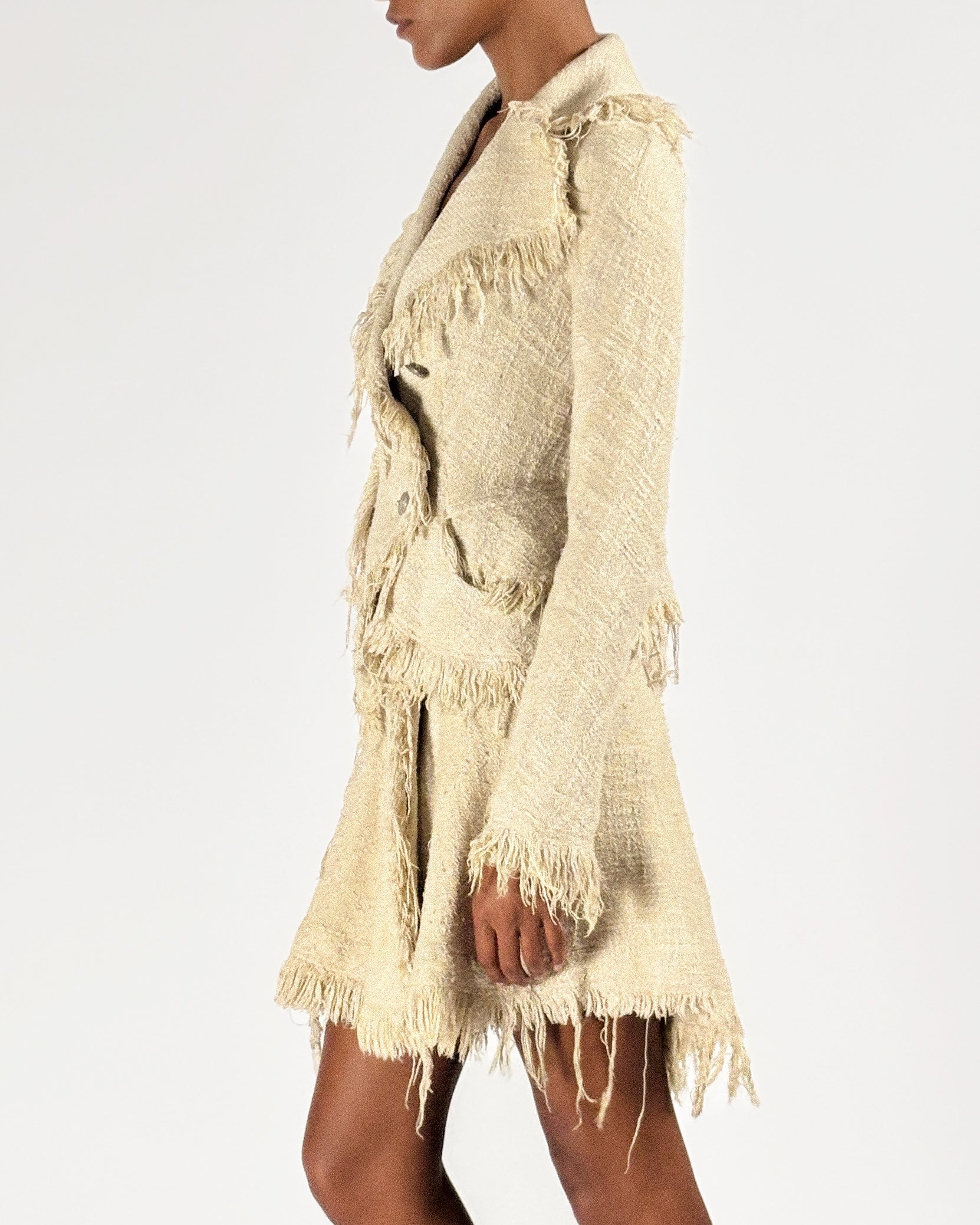 Gold-label distressed fringe suit featuring an asymmetric jacket and matching skirt from the Vivienne Westwood Spring/Summer 1997 'Vive la Bagatelle' runway.